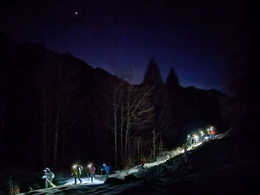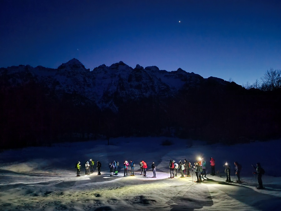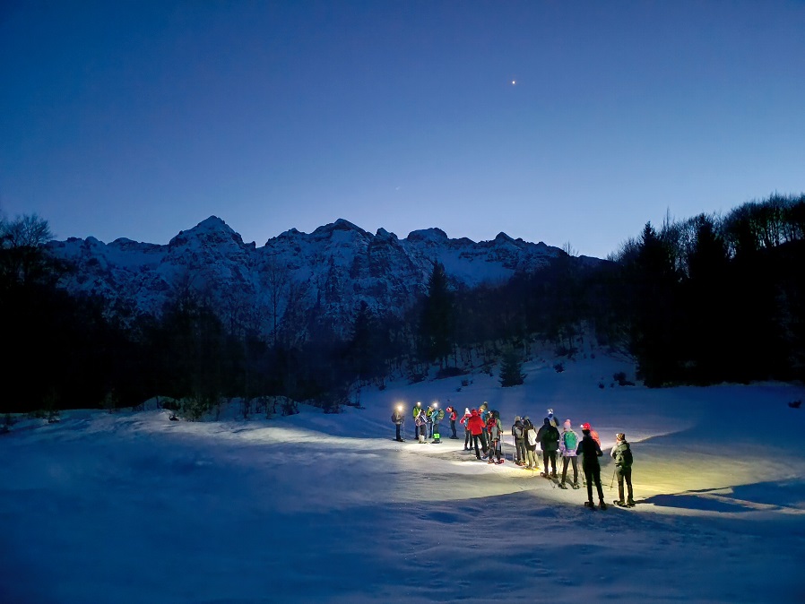 Dopo esserci trovati a Valli del Pasubio, saliremo in auto fino a 980 m di quota, dove inizierà il nostro percorso, per la maggior parte su neve fresca non battuta ai piedi del Sengio Alto e Monte Pasubio. Arriveremo ai 1200 m di Malga Cornetto dove per cena troveremo ottimi piatti tipici. Il ritorno sarà in un altro itinerario, faremo così un giro ad anello di circa 6-7km. Ritorno alle auto verso le ore 23.00/23.30 circa.